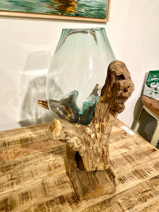 Holzskulptur / Deko-Wurzel mit Glasvase(n) in Tropfenform, verschiedene Ausführungen