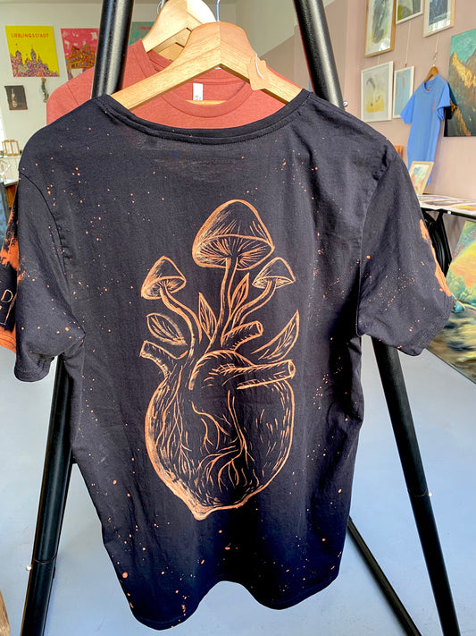 Handgebleichtes Unikat T-Shirt – Herz mit Pilzen | Kunstshirt aus Bamberg | Artwear KDB