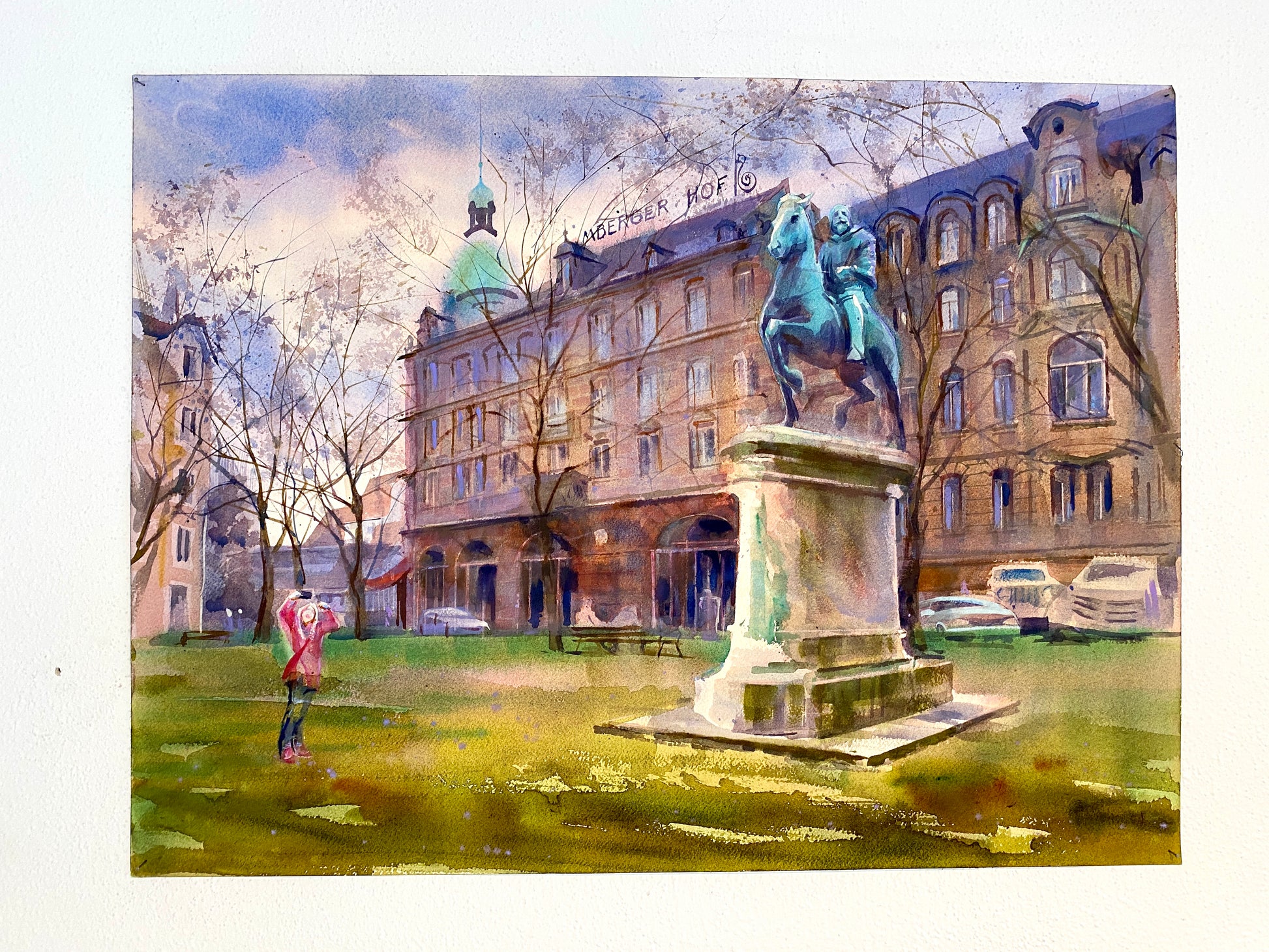 Dieses besondere Aquarell von Alexander Vasilyev zeigt den Bamberger Reiter in einer unerwarteten, modernen Perspektive: nicht wie gewohnt im Dom, sondern als frei interpretierte Reiterfigur im Stadtraum. Vor der historischen Kulisse des traditionsreichen „Bamberger Hof“ entfaltet sich ein lebendiges, urbanes Stadtbild, das Geschichte und Gegenwart kunstvoll miteinander verbindet.
