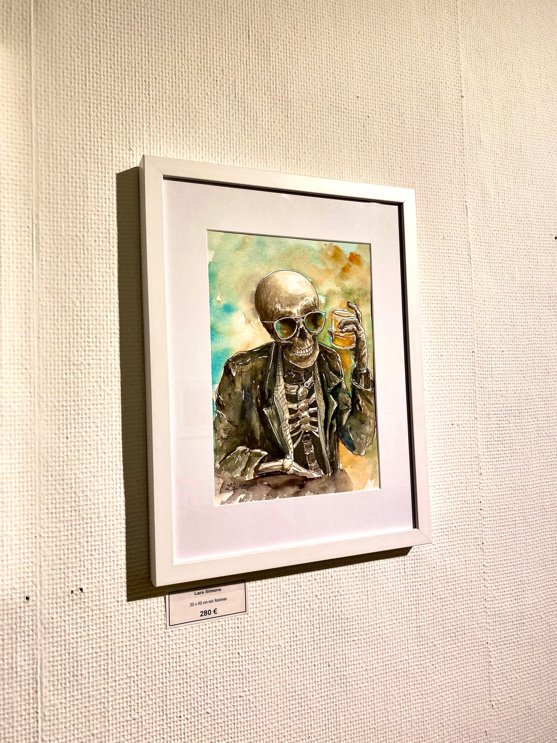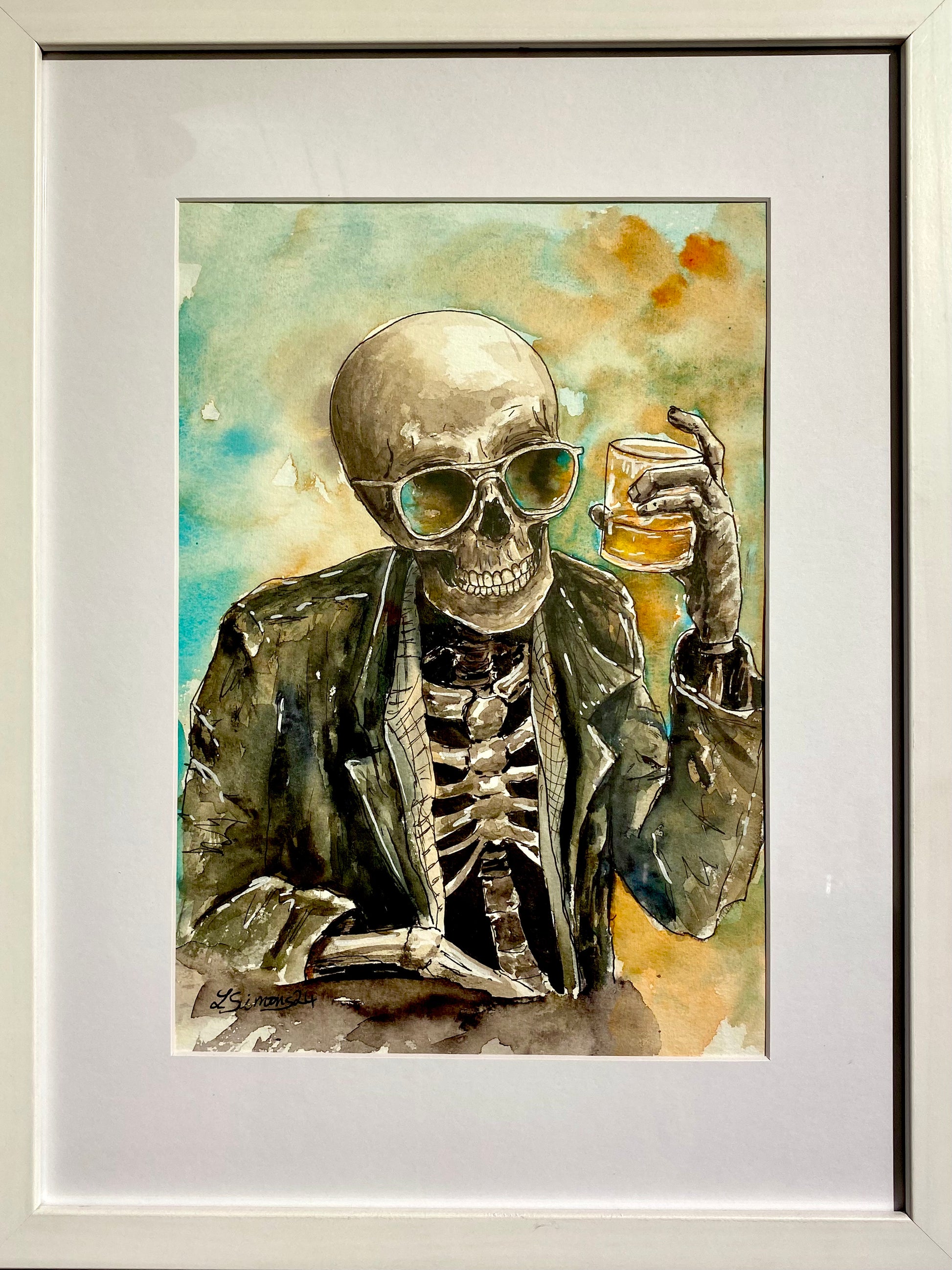 "Ein Toast auf das Leben" ist ein humorvolles und zugleich tiefgründiges Kunstwerk, das die Vergänglichkeit des Lebens mit einem Augenzwinkern thematisiert. Ein stilvolles Skelett im Jackett, mit Sonnenbrille und einem Glas Whiskey in der Hand, hebt das Glas auf die Freuden und die Schönheit des Daseins. Die lebendigen Farben und die feinen Details fangen die Essenz des Moments ein und erinnern daran, das Leben in vollen Zügen zu genießen - unbeeindruckt von dessen Endlichkeit.