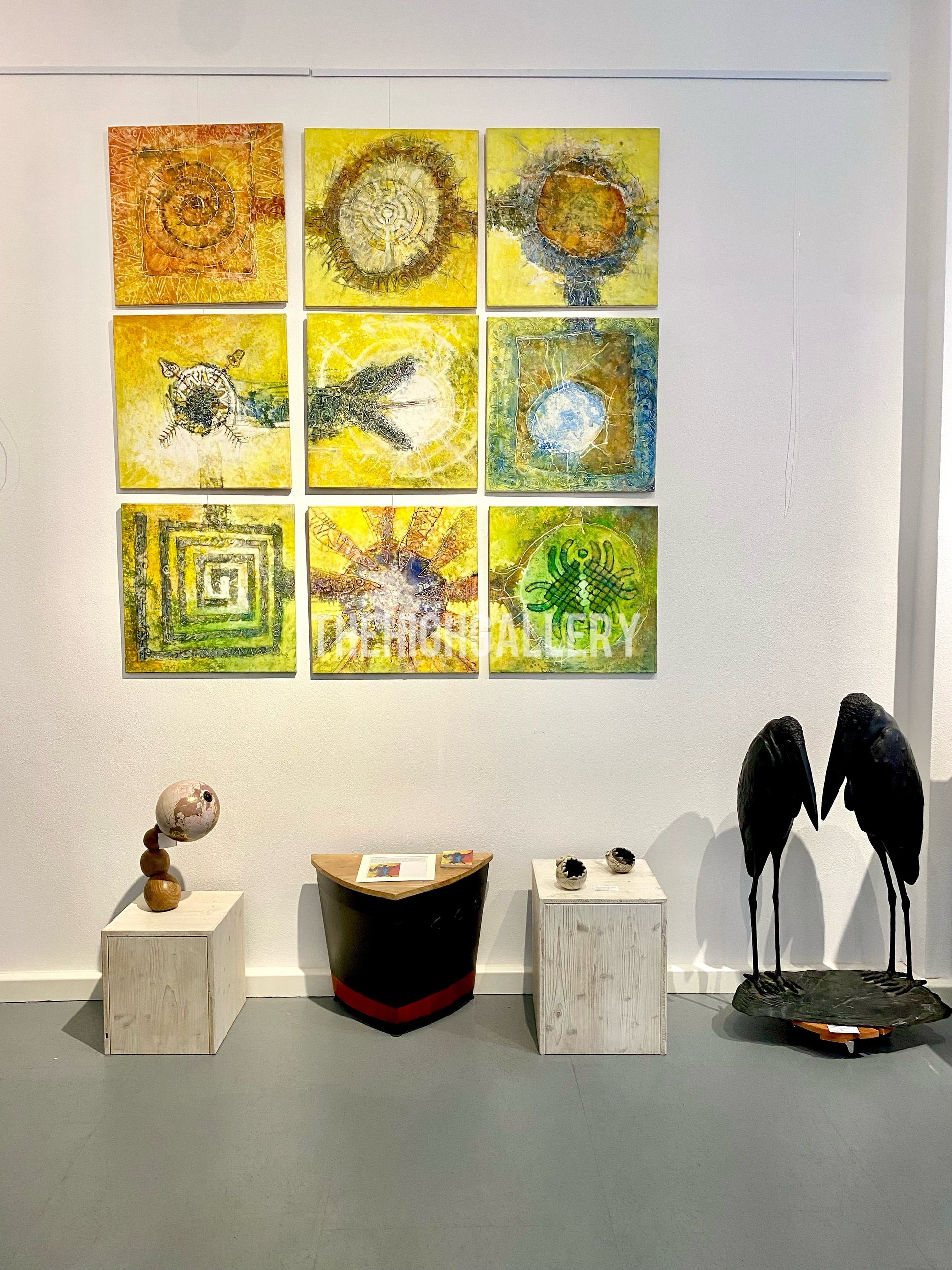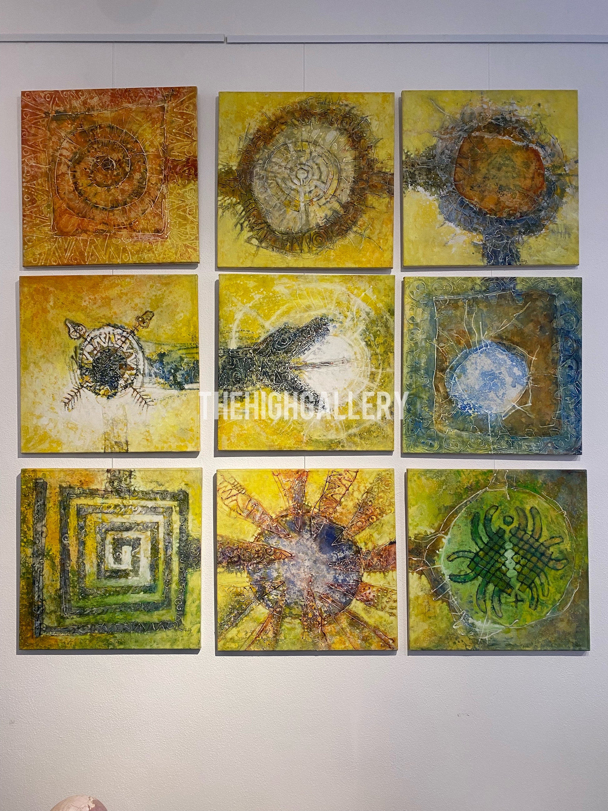 Dieses Werk besteht aus neun einzelnen Bildern, die sich zu einem größeren Ganzen fügen. Jedes Bild zeigt ein eigenes Symbol – Spiralen, Sonnen, Tiere, abstrakte Formen – und erinnert an uralte Zeichen, die den Kreislauf des Lebens und die Ordnung des Kosmos widerspiegeln.