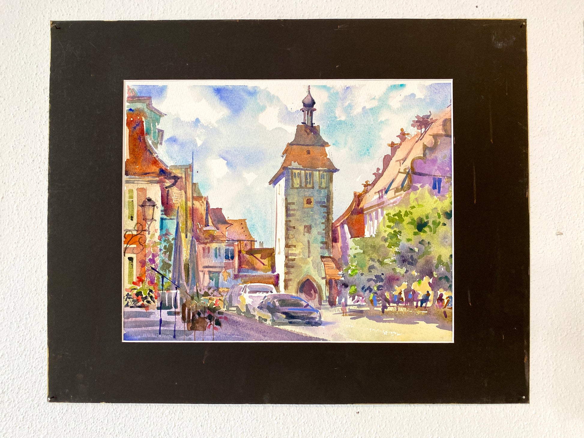 Dieses farbenfrohe Aquarell von Alexander Vasilyev zeigt eine lebendige Altstadtszene mit einem markanten historischen Stadtturm, eingerahmt von engen Gassen, traditionellen Häusern und sommerlichem Licht. Die warme Farbgebung, die lockeren Aquarellverläufe und die harmonischen Schatten verleihen dem Motiv eine einladende, fast märchenhafte Atmosphäre.