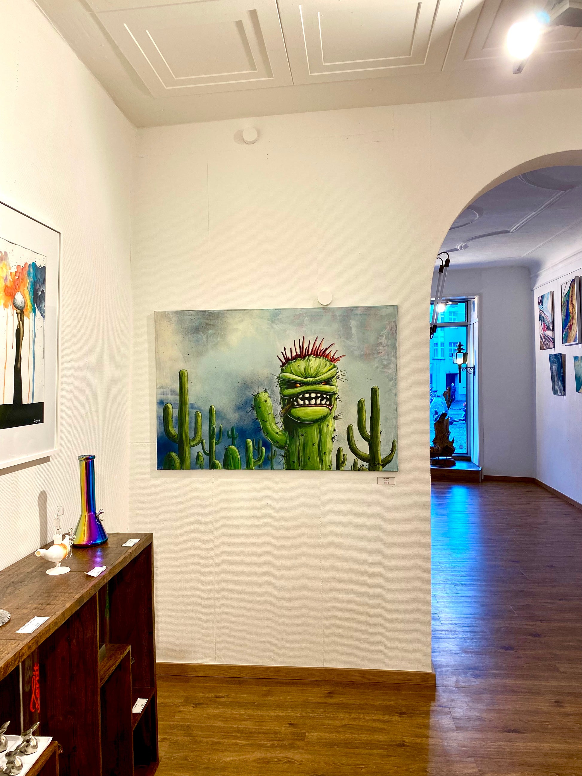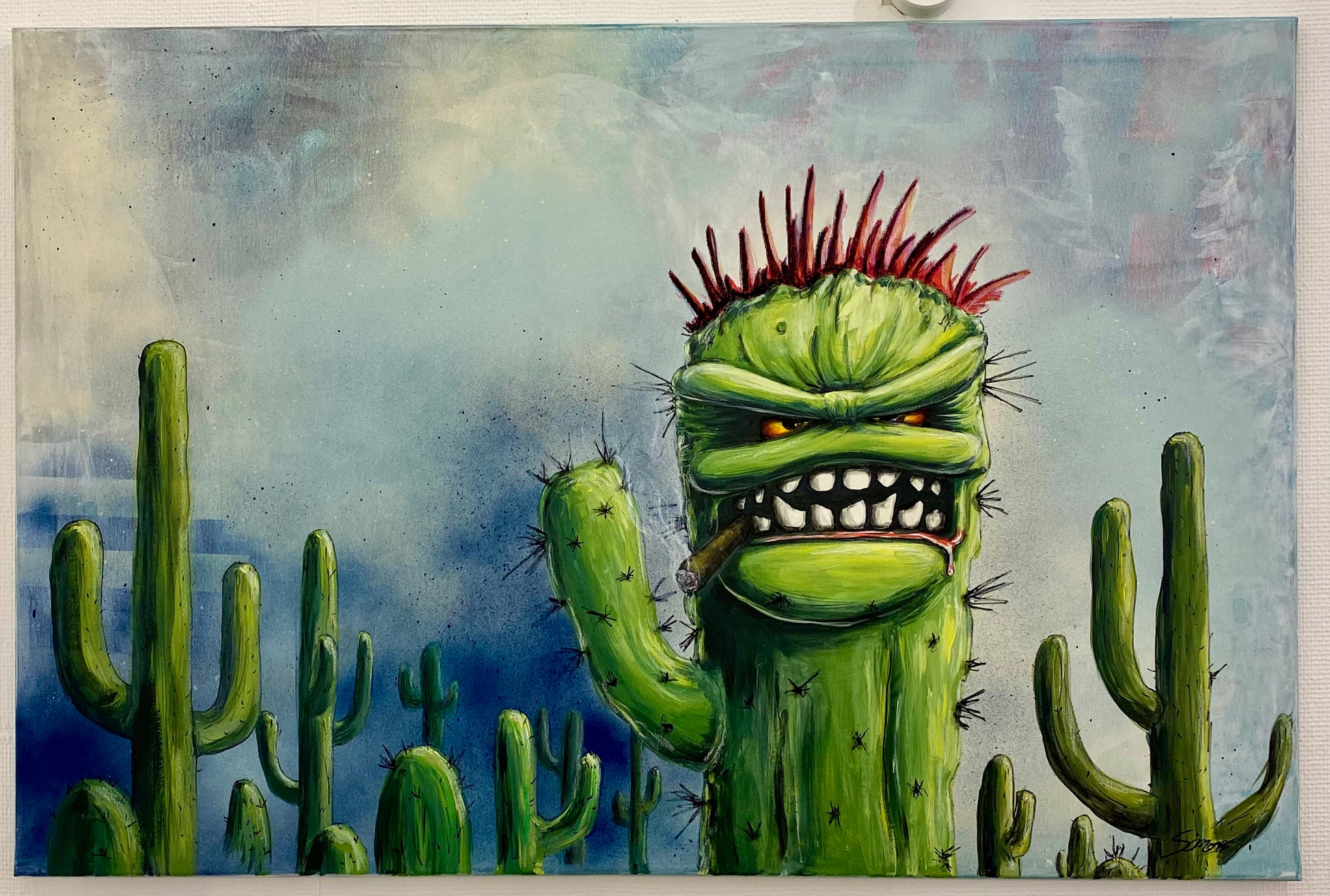 Ein humorvolles und zugleich surreal anmutendes Kunstwerk im Stil von Pop- und Urban-Art. Der Hauptfokus liegt auf einem ungewöhnlichen Kaktus mit menschlichem Gesicht, der zwischen einer lebendigen Kakteenlandschaft thront. Die kräftigen Farben und klaren Linien verleihen dem Bild eine energiegeladene Atmosphäre, während es auf spielerische Weise die Grenze zwischen Natur und Mensch hinterfragt. Ein echter Blickfang für Kunstliebhaber mit einem Faible für das Besondere und Abstrakte!
