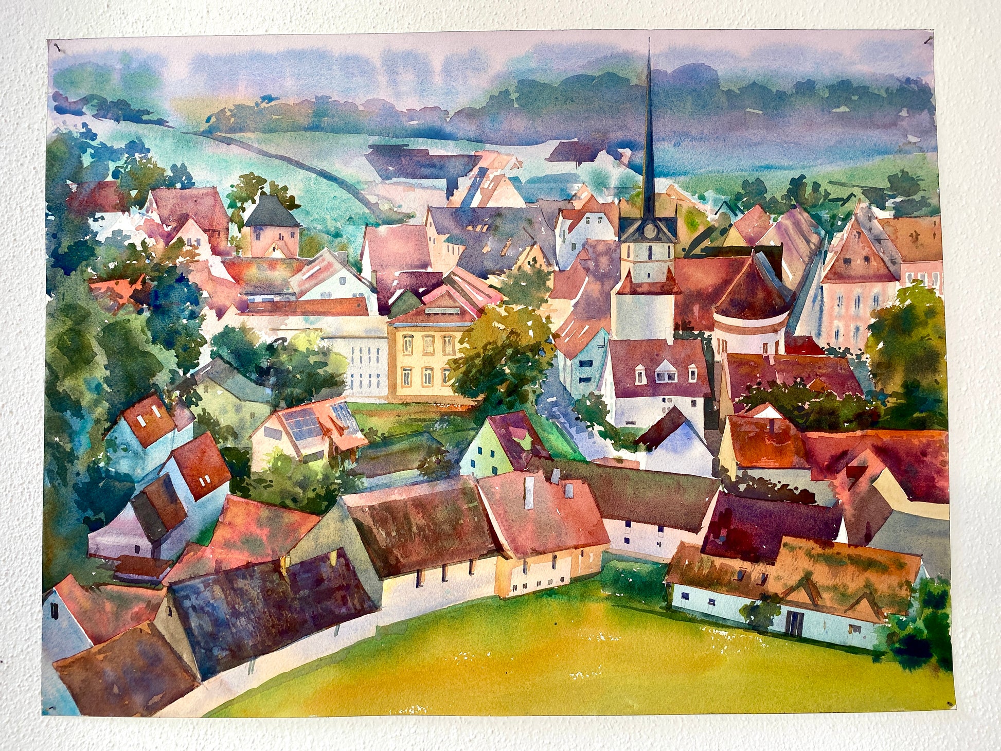 Die sanften Hügel im Hintergrund, die üppigen Bäume und die klaren, frischen Farben verleihen dem Werk eine warme, sommerliche Atmosphäre. Die lockere Aquarelltechnik bringt Bewegung und Leichtigkeit in die Szene und spiegelt das typische fränkische Dorfleben wider – verwinkelt, lebendig und voller Charakter.
