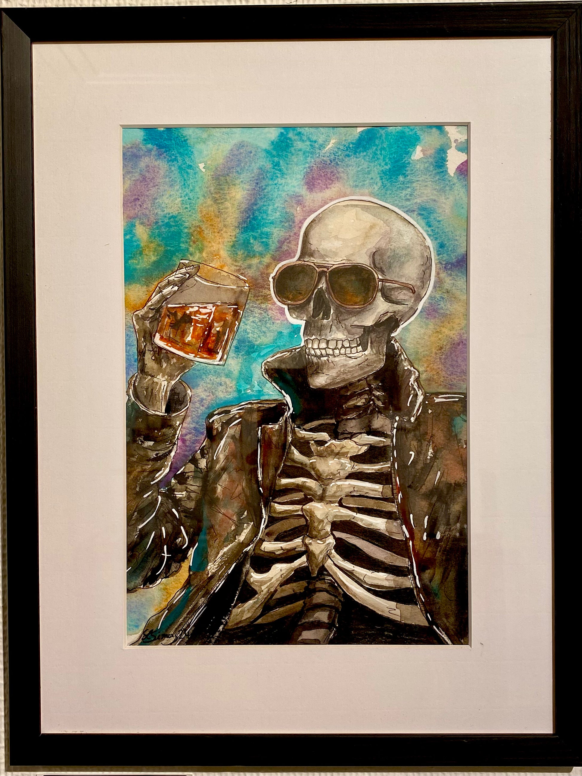 Dieses eindrucksvolle Kunstwerk zeigt Skelett mit Sonnenbrille und einem Glas Whiskey in der Hand - ein humorvoller, aber tiefgründiger Blick auf das Leben und dessen Vergänglichkeit, der die genussvollen Momente im Leben betonen soll. "Looking back to memories" erinnert uns daran, den Moment zu genießen und das Leben bewusst wahrzunehmen, auch angesichts unserer Endlichkeit. Die leuchtenden Farben und die ausdrucksstarke Symbolik machen dieses Werk zu einem einzigartigen Statement über Lebensfreude und Reflexion.