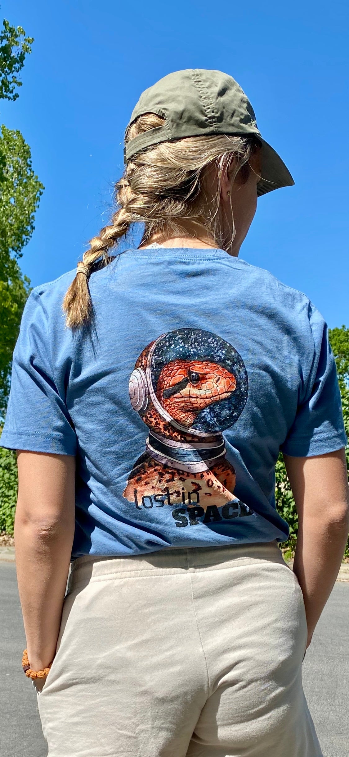 Das Motiv stammt von der Künstlerin Lara Simons und zeigt auf dem Rücken eine Schlange im Leoparden-Astronautenanzug, schwerelos im Weltall. Begleitet vom Schriftzug lost in SPACE erzählt das Design von Orientierungslosigkeit, kosmischer Weite und einem Augenzwinkern Richtung Unendlichkeit.