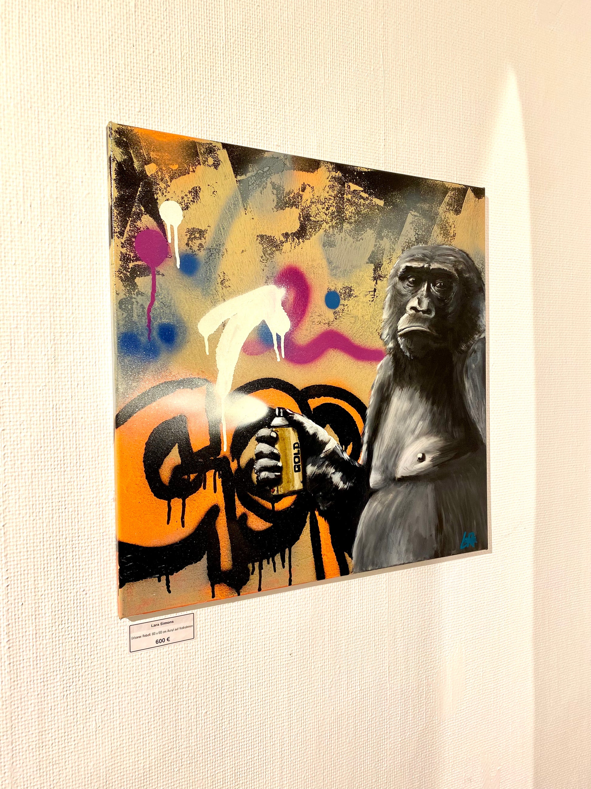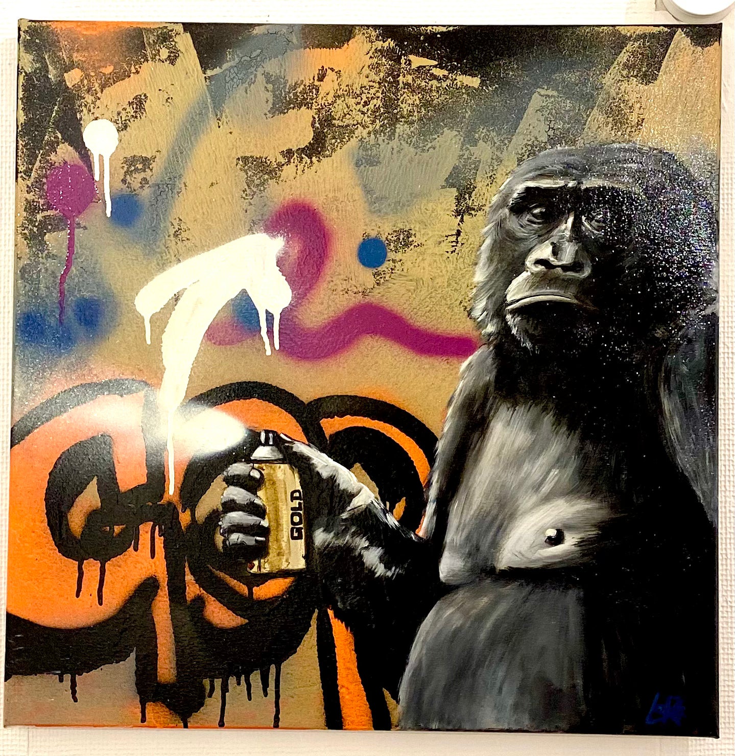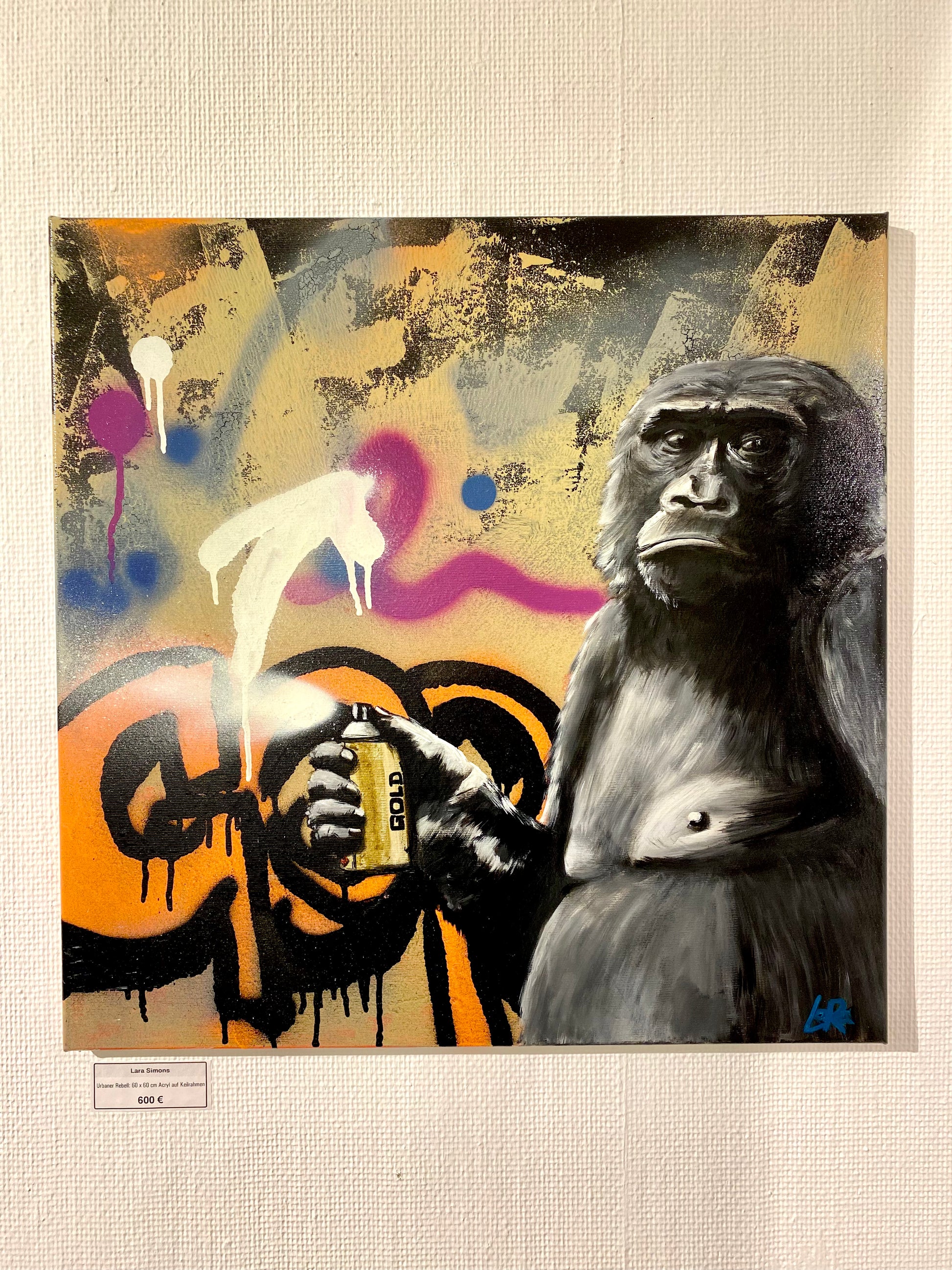 Dieses dynamische Gemälde von Lara Simons verbindet auf eindrucksvolle Weise Realismus und Street-Art-Ästhetik. Vor einem farbenfrohen Graffiti-Hintergrund steht ein realistischer Gorilla, der mit einer Farbspraydose in der Hand selbst zum Street-Art-Künstler wird. Das Werk spielt humorvoll mit der Vorstellung von Wildnis und urbanem Raum und vermittelt gleichzeitig eine Botschaft über Kreativität und Selbstausdruck. Ein kraftvolles Stück, das die Grenzen zwischen Kunststilen sprengt und zum Nachdenken anregt.