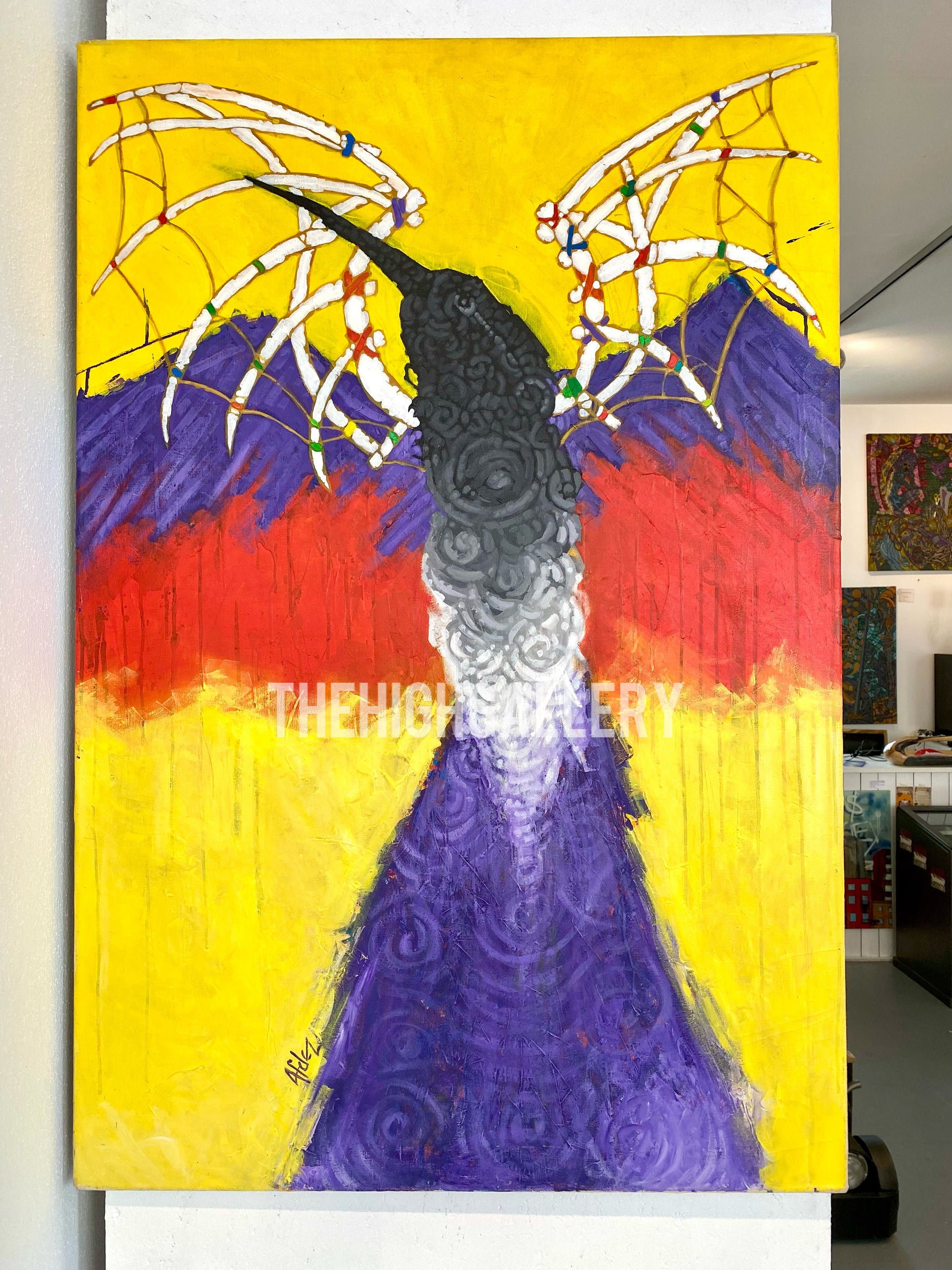 „Volante“ verkörpert den Moment des Abhebens, das Gefühl von Freiheit und Schwerelosigkeit. Die Figur mit ihren weit ausgebreiteten Flügeln scheint aus der Dunkelheit aufzusteigen und in ein Feld aus leuchtenden Farben einzutreten.